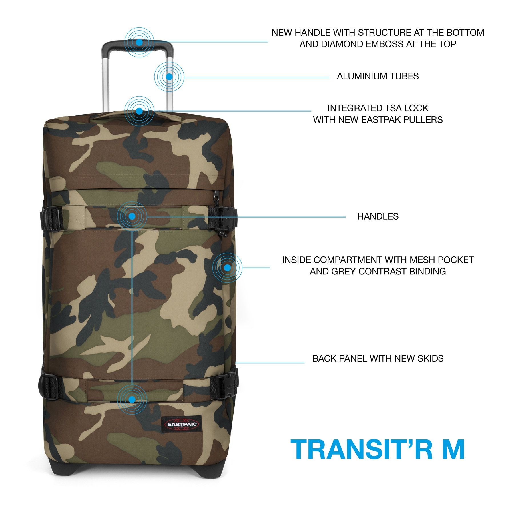 De Transit'r M van Eastpak is een tas die je als gewiekste reiziger gewoon móet hebben. Het is de perfecte mix van veiligheid en stijl. De nieuwe Transit'r is verbeterd door de extra versteviging bij de voeten aan de onderkant en deze wieltas heeft een vast TSA cijferslot gekregen voor veilig reizen van en naar de VS. In deze met rits afgesloten grote wieltas zitten 2 compartimenten met rits waarvan 1 met inpakriemen. Voorop de tas zit een ruim ritsvak. Aan de zijkanten van de tas zitten compressiebanden. Met de 4 handvatten rondom de reistas kun je de tas makkelijk van de vliegtuigband pakken. In combinatie met het slimme wielsysteem en uitschuifbaar handvat ga je comfortabel op reis. Het is de perfecte metgezel voor de urban adventurer!