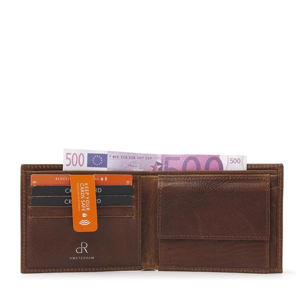 Deze mooie van rundleder gemaakte billfold heeft een klassiek uiterlijk en tijdloos design. De billfold is erg functioneel in gebruik, het heeft plaats voor 4 passen en heeft twee vakken voor papiergeld. Muntgeld kan eenvoudig worden opgeborgen in het daarvoor bestemde vak met klep en drukknop. Daarnaast is er een extra steekvak. Deze billfold beschikt over RFID protectie. Dit beschermt tegen het skimmen van betaalpassen.