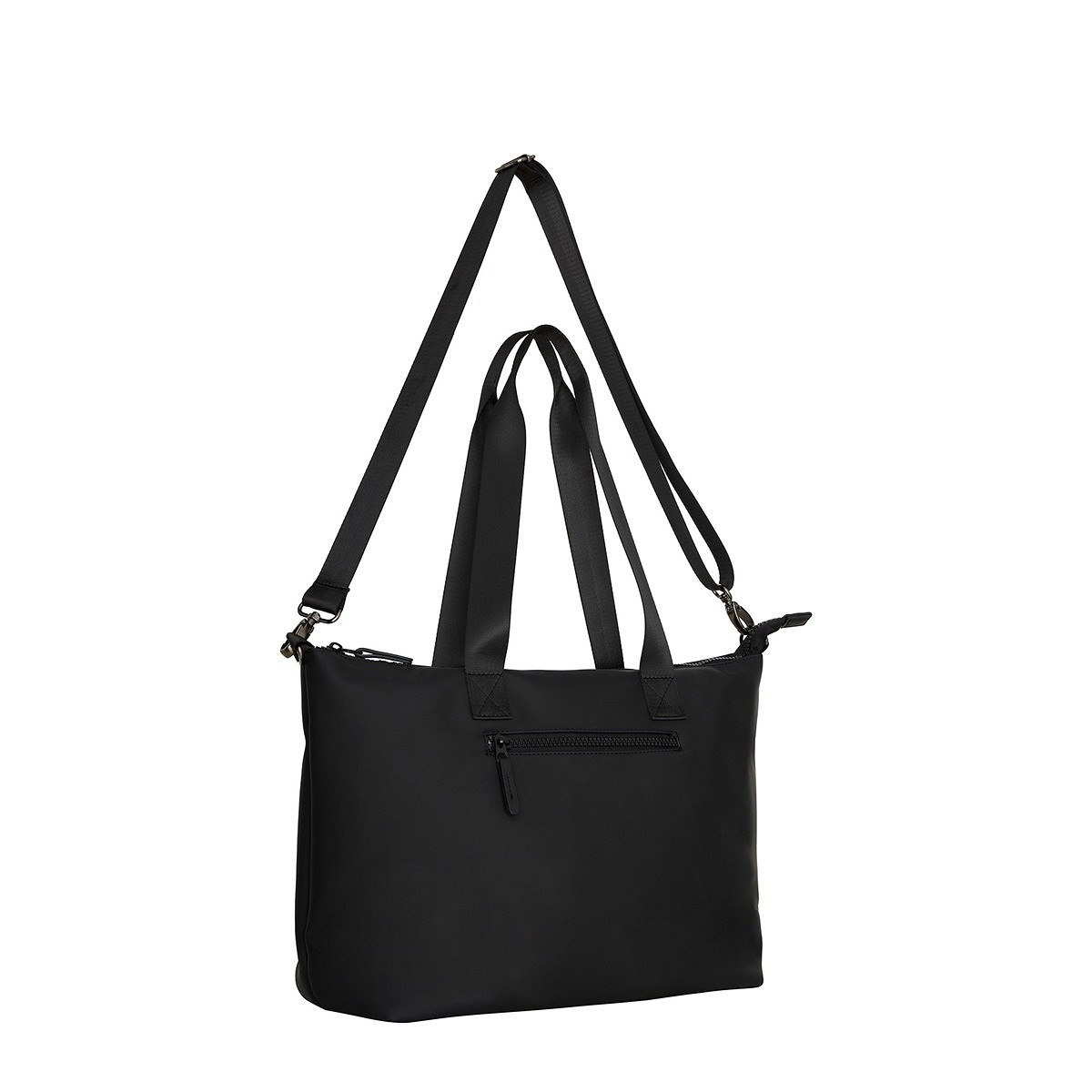 Deze lekkere ruime shopper is gemaakt van een waterdicht PU-rubber materiaal. Achterop de tas zit een handig rits-vak waar je snel en makkelijk bij kan. In de tas vind je een rits-vakje, een ruim open vak, een smartphone-vak en een gewatteerd vak voor een kleine laptop of tablet. Je draagt de tas aan de 2 ruime handvatten of aan de meegeleverde lange schouderband.