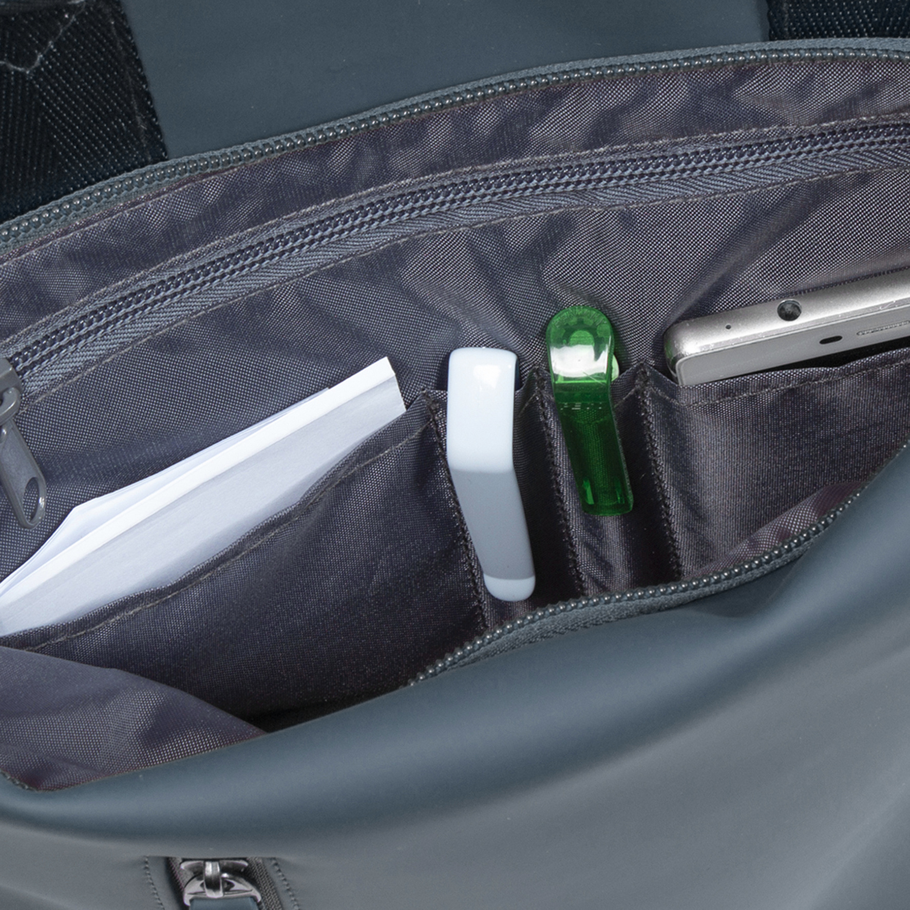 Bovenaan de tas zit een handvat, hiermee kan je de tas ook in je handen dragen.