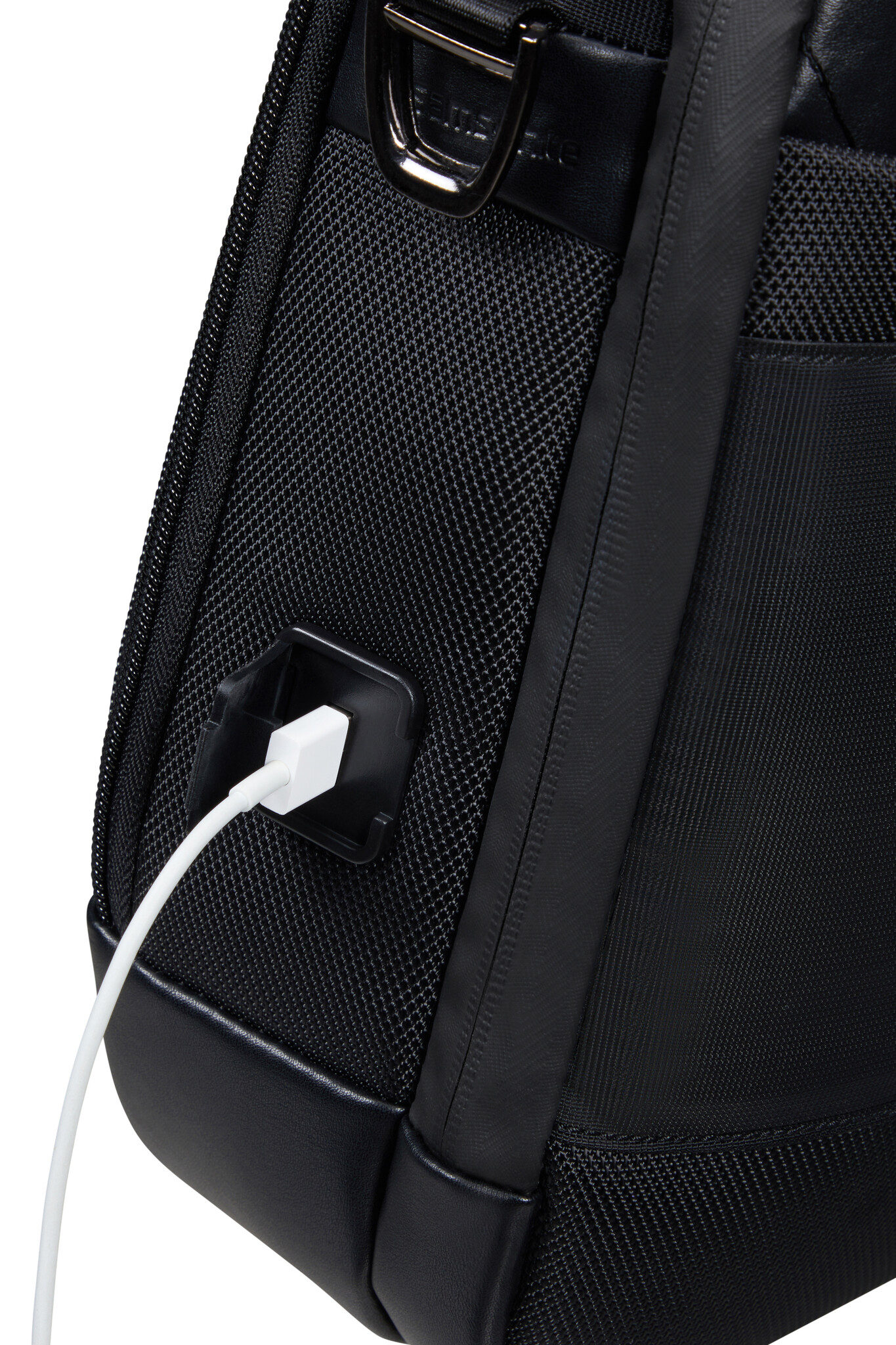 Er zijn 2 grote vakken afgesloten met een rits, een ruim ritsvak achterop, 2 kleine ritsvakken voorop de tas en een ruim voorvak met organizer. In de hoofdvakken zitten een 14.1" laptopvak, een tabletvak, 2 open vakken en 2 ritsvakken. Ook is er een vakje voor een powerbank, deze kunnen je in de tas aansluiten en via een USB aansluiting aan de buitenkant kan je bv je smartphone opladen. Superhandig! Met de trolleysleeve zet je de tas makkelijk op een reiskoffer, fijn en comfortabel reizen.