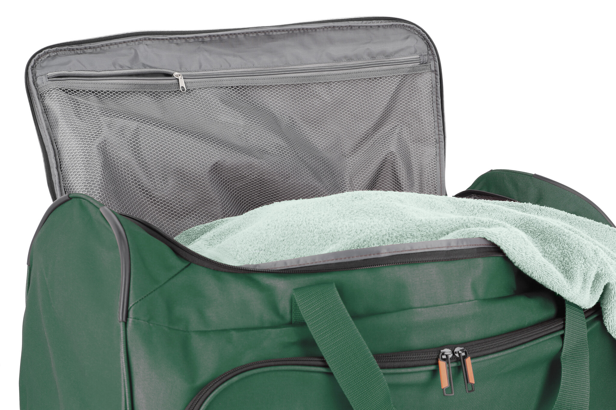 De tas is afgesloten met een rits en beschikt over een groot mesh-vak met rits aan de binnenkant, ideaal voor het georganiseerd opbergen van kleinere items. Aan de voorkant bevindt zich een ruim ritsvak, perfect voor reisdocumenten of andere essentials die je snel bij de hand wilt hebben.
